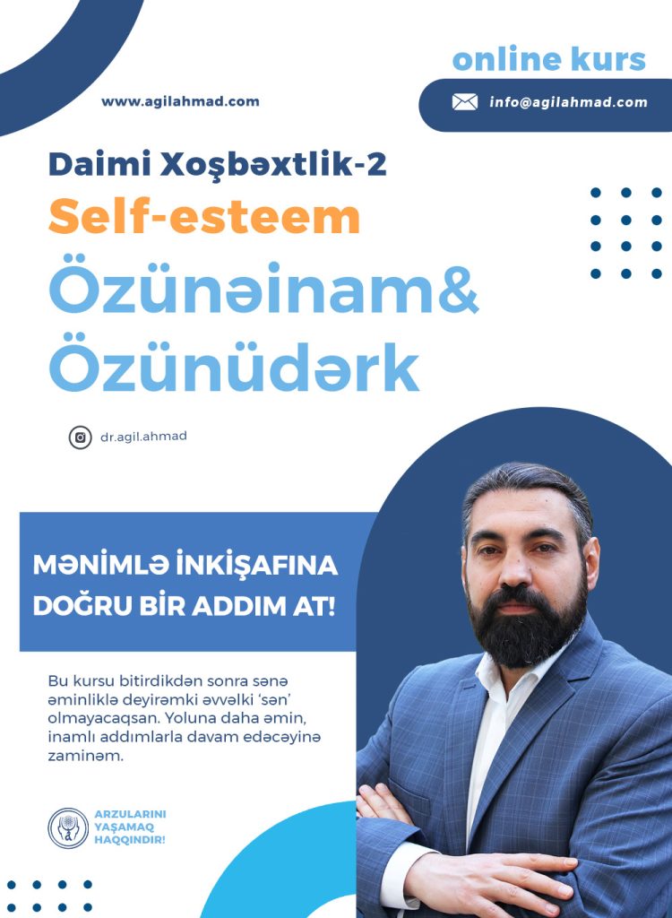 Bu münasibətlə sizə “Daimi Xoşbəxtlik (2): Self-esteem, Özünəhörmət, Özünəinam və Özünüdərk” adını verdiyim 9 həftəlik təlim proqramı haqqında qısa məlumat vermək istəyirəm.